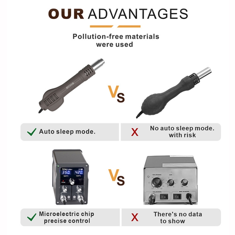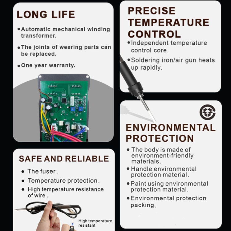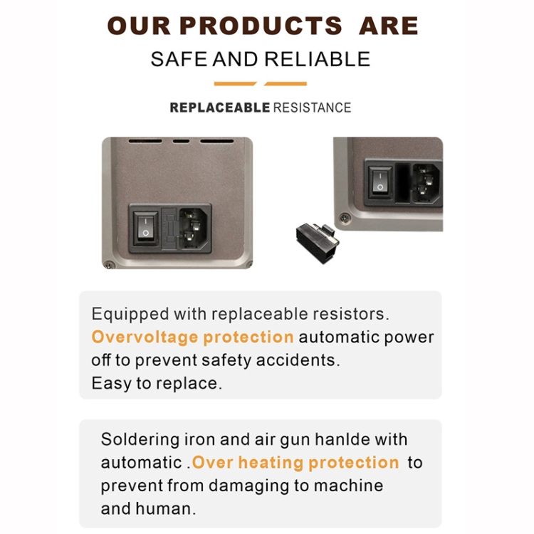 7. Equipped with replaceable resistors, overvoltage protection automatically power off to prevent safety accidents. The soldering iron and air gun handles are automatically protected from overheating to prevent damage to machines and people.