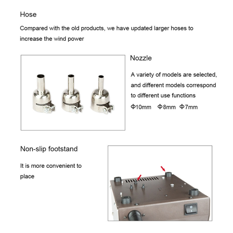 2. A magnetic switch is installed on the handle of the heat press gun. When the heat press gun is placed in the bracket, it will automatically enter the cooling standby mode. When you pick up the heat press gun, it will quickly heat up to the set temperature.
