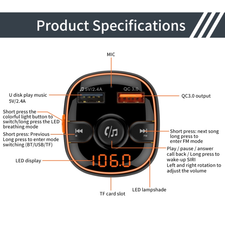 BC52 QC3.0 Fast Charging Car Colorful Atmosphere Light Bluetooth MP3 Player FM Transmitter