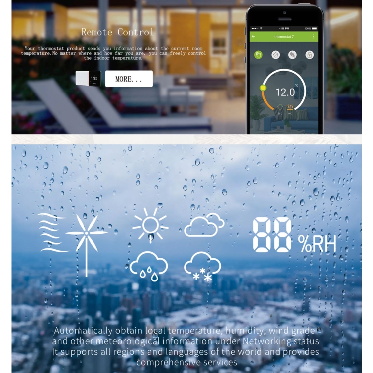 3. The thermostat can be controlled by mobile phone anytime and anywhere. When you connect the thermostat with the mobile phone, the thermostat will display the local weather, habits and humidity, and check the current status through the app
