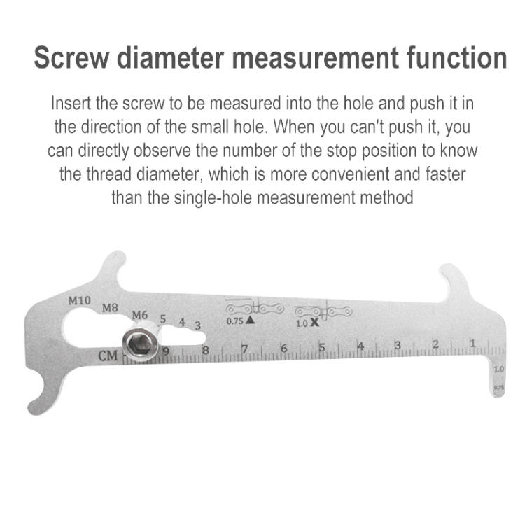 Function: Measure the degree of wear of the chain (0.75 means wear, 1.0 means severe wear); chain maintenance hook; measure length; measure thread diameter
