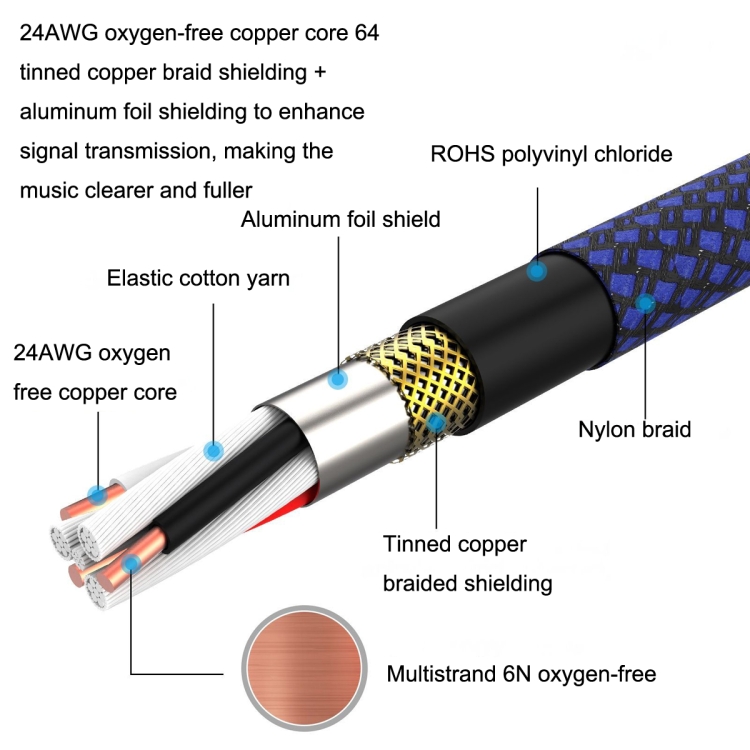 3. 24AWG oxygen-free copper core 64 tinned copper braid shielding + aluminum foil shielding to enhance signal transmission, making the music clearer and fuller
