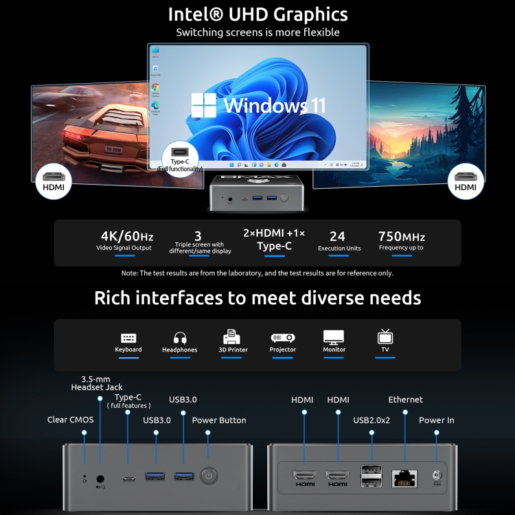 10. Interface: Type-C x 1, HDMI 2.0 x 2, USB 3.0 x 2, USB 2.0 x 2, Net RJ45 x 1, Earphone jack x 1, Power-in x 1