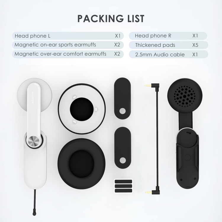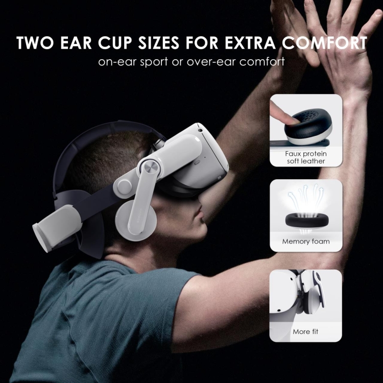 3. Replaceable earmuffs design: Equipped with a pair of over-ear sports small earmuffs and a pair of over-ear comfortable large earmuffs, suitable for intense sports or watching movies. The earmuffs are supported by high-quality protein leather and memory foam, which are soft, breathable, and fit, which can effectively improve the sound insulation of the earphones and allow you to achieve a more immersive VR experience.