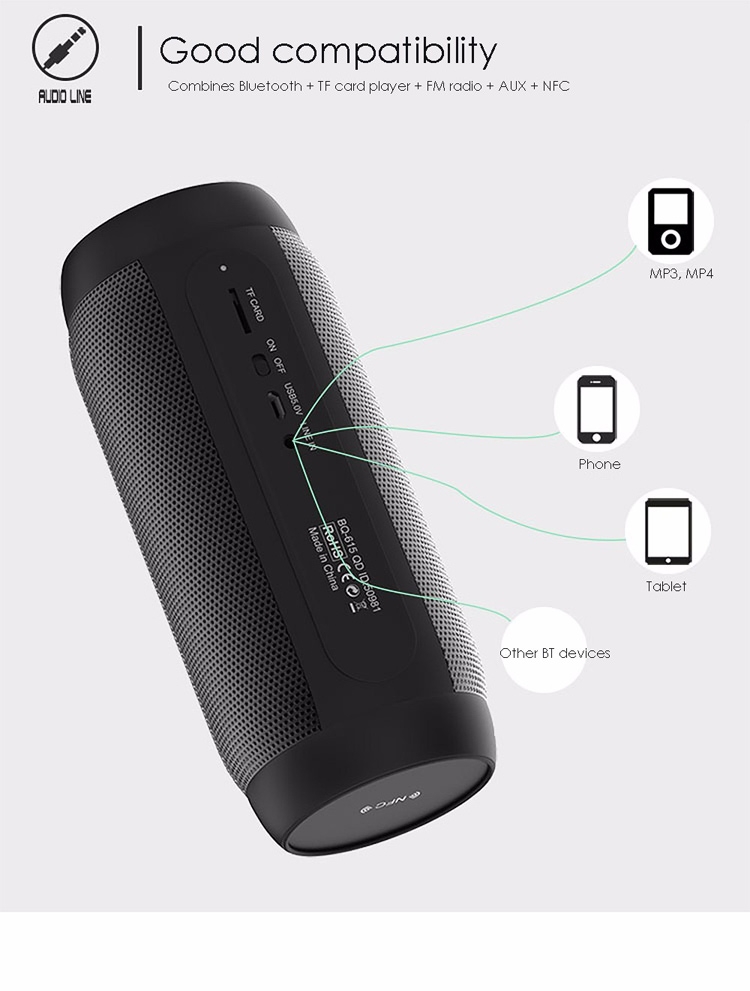 Combines Bluetooth + TF card player + FM radio + AUX + NFC