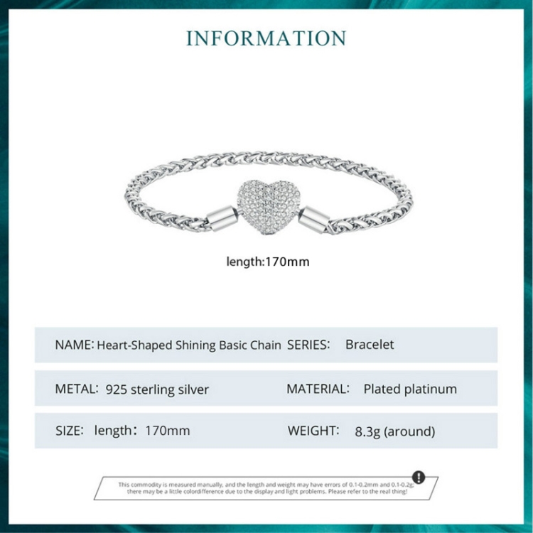 BSB133-17 Sterling Silver S925 White Gold Plated Zircon Heart Sparkling Bracelet