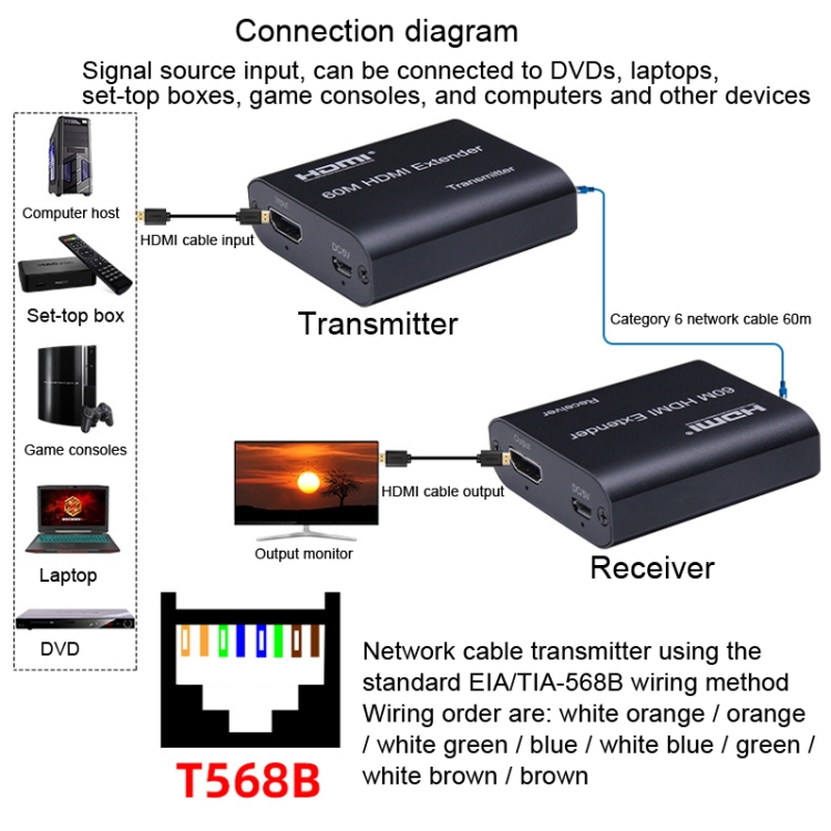6. Network cable transmitter using standard EIA/TIA-568B wiring method, the wiring order are: white orange / orange / white green / blue / white blue / green / white brown / brown