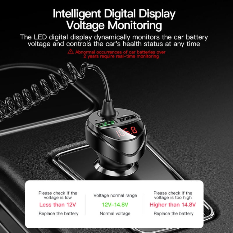 C68 LED Digital Display QC3.0 Fast Car Charger 3 in 1 with Spring Cable