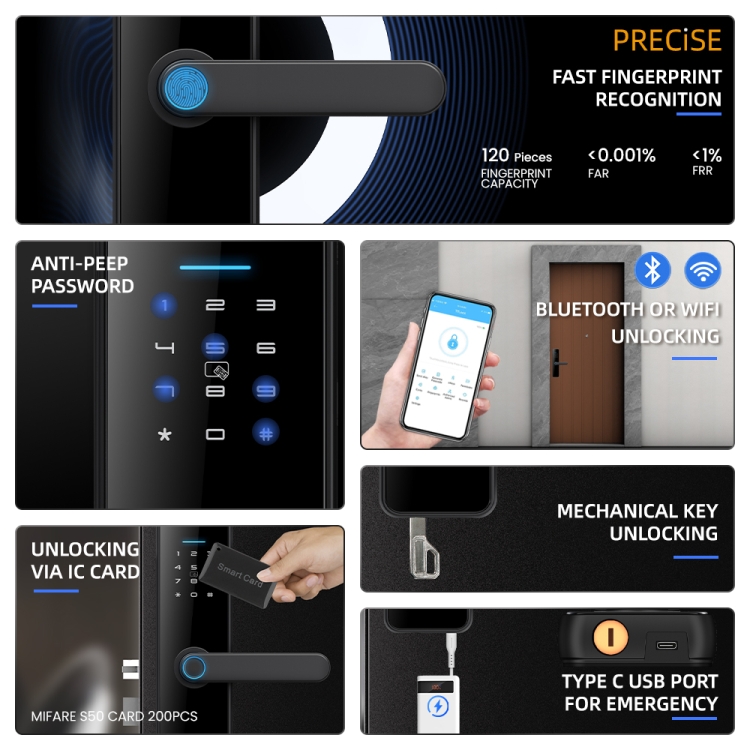 17. Unlocking methods: APP, password, fingerprint, IC card, mechanical key