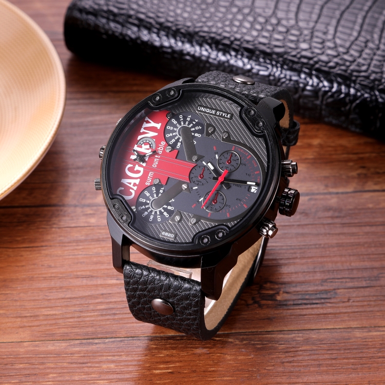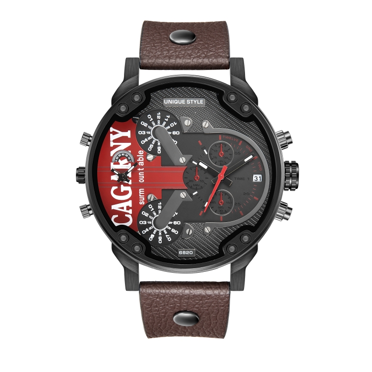 CAGARNY 6830 Men Dual Movement Red Face Leather Strap Quartz Watch