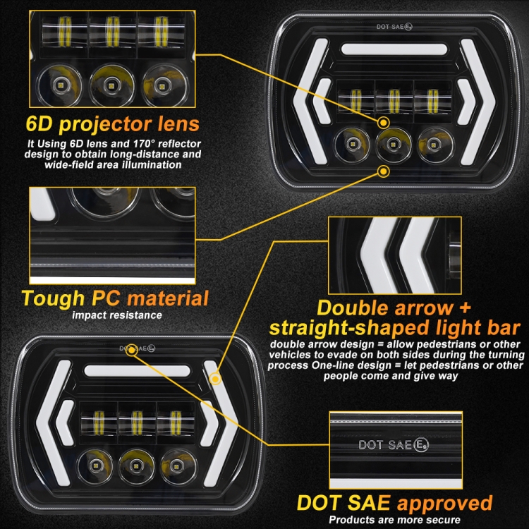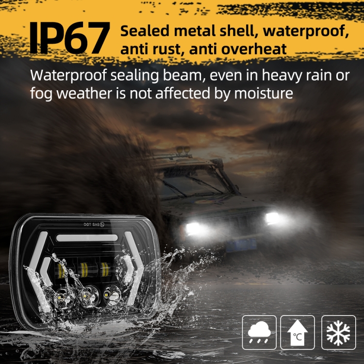 1. 7×6 (5×7) LED headlights (H6054 H5054), using OSRAM LED chips, with amber turn signals and white daytime running lights. Built-in double arrows on both sides + top-shaped LED light bar, the new design allows you to better remind the opposite passer-by or incoming car when you need to turn, so that the other party can take corresponding measures in time, stop passing or avoid, follow Comparing similar products with turn signal function, it can more clearly allow the other party to distinguish the drivera??s direction in bad weather such as rain and fog. The headlight structure adopts the condensing + floodlight design, which makes the center point of the high beam have a wider illumination range, greatly Improve driving safety. 2. The brightness of LED headlights is twice that of ordinary original car halogen lights. It is the best choice for upgrading vehicles. It makes the driver brighter on the road at night and ensures that you drive home safely. 3. H4 connector plug and play (with H4 conversion cable), the red line is the daytime running light (white light), the green line is the turn signal (yellow light), usually within 20 minutes or less. 4. Compatible with any vehicle with 5×7 inches (also known as 7×6) square headlights, such as: Jeep Cherokee XJ 1984-2001, Jeep Wrangler YJ 1987-1995, Jeep Comanche MJ 1986-1992, some cars may need to use an adapter to The pins are swapped to different positions to work properly. Very few old Japanese brand cars need to buy additional relay kits. .