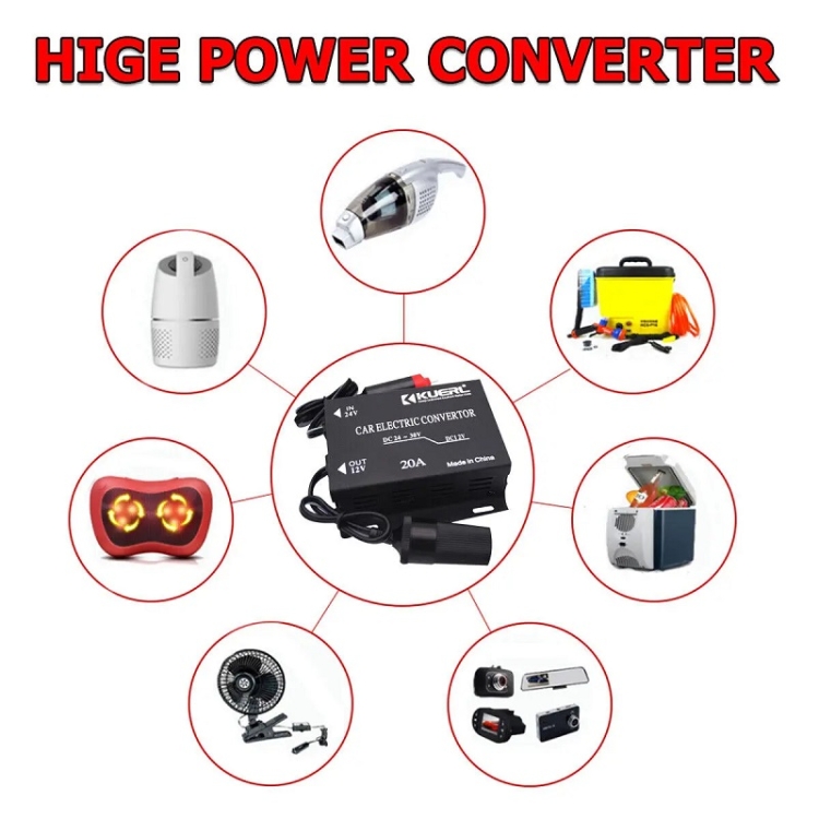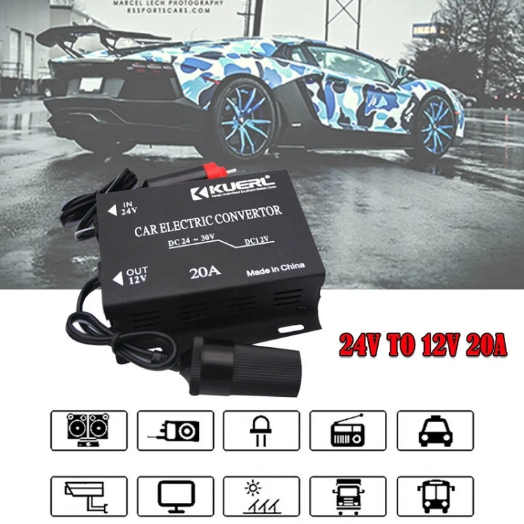 8. Allows you to convert DC 24V voltage to DC 12V voltage to power 9. 12V devices that can be used in 24V vehicles, such as auto stereos, subwoofers, GPS navigators