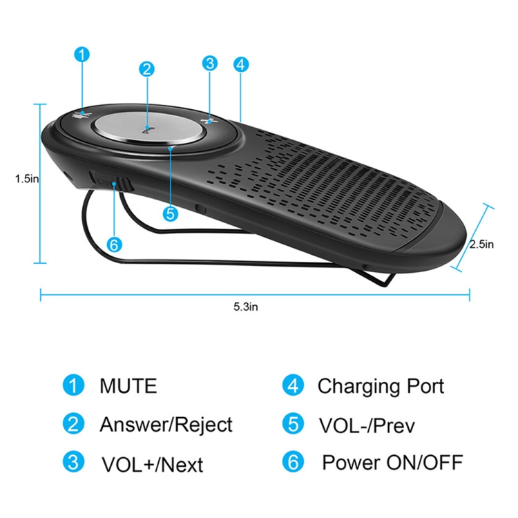1. Automatic power-on, hands-free call, noise cancellation, call with voice commands, navigation broadcast, mobile phone automatic pairing, voice guidance for incoming calls, sun visor clip, allowing simultaneous connection of 2 mobile phones.