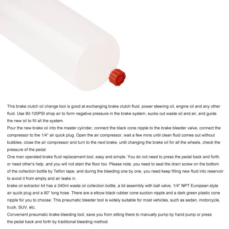 3. One man operated brake fluid replacement tool, easy and simple. You do not need to press the pedal back and forth, or need other’s help, and you will not stain the floor too. Please note, you need to seal the drain screw on the bottom of the collection bottle by Teflon tape, and during the bleeding one by one, you need keep filling new fluid into reservoir to avoid it from empty and air leaks in.