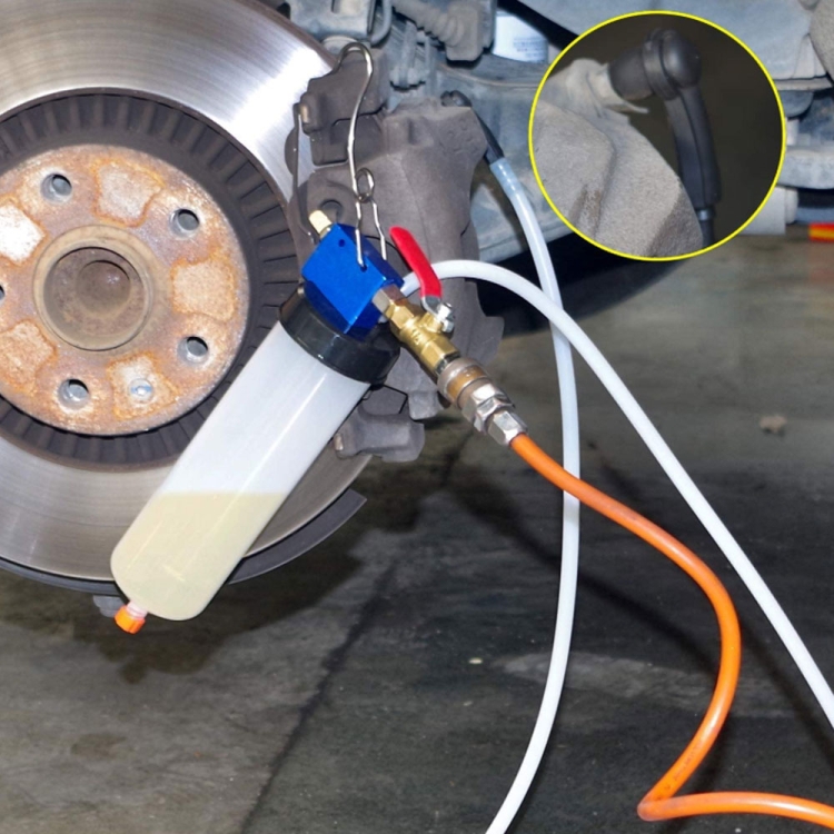 2. Pour the new brake oil into the master cylinder, connect the black cone nipple to the brake bleeder valve, connect the compressor to the 1/4 inch air quick plug. Open the air compressor, wait a few mins until clean fluid comes out without bubbles, close the air compressor and turn to the next brake, until changing the brake oil for all the wheels, check the pressure of the pedal.