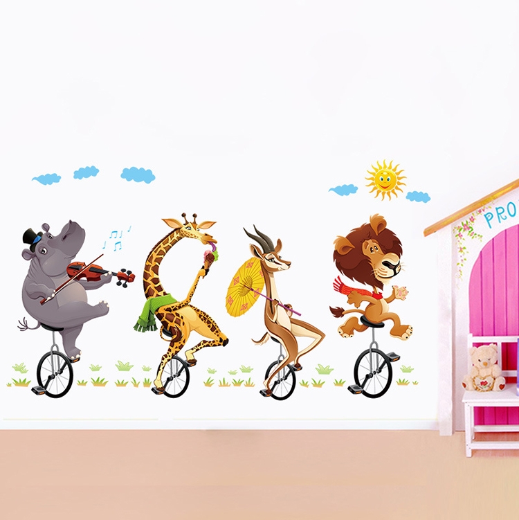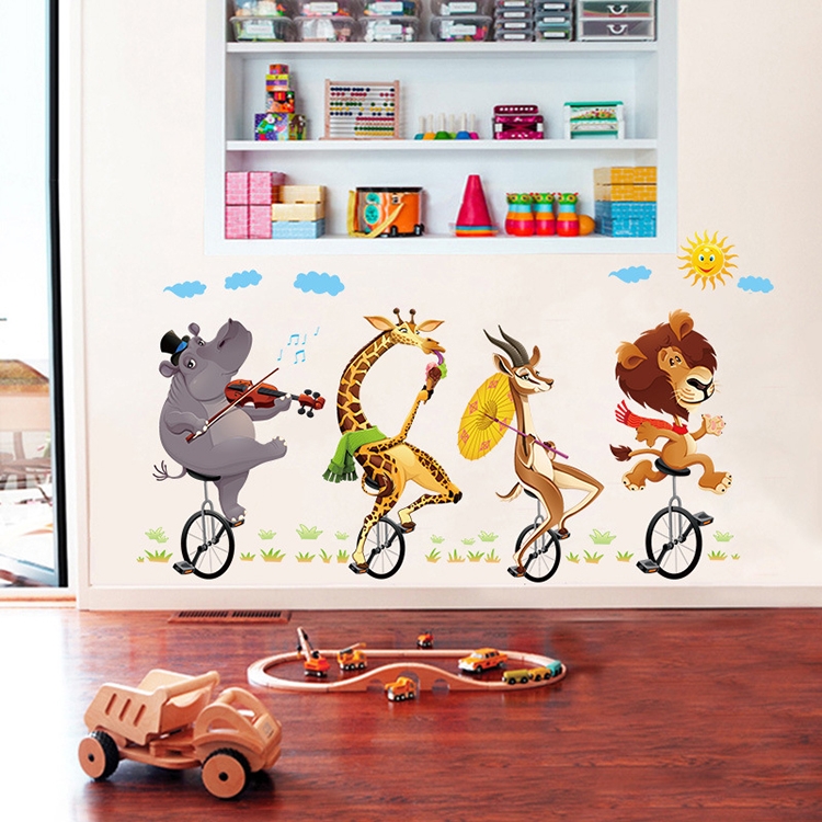 Cartoon Animal Bicyling Wall Sticker Lion Giraffe Sticker Children Room Bedroom Background Wall Ornament Stickers