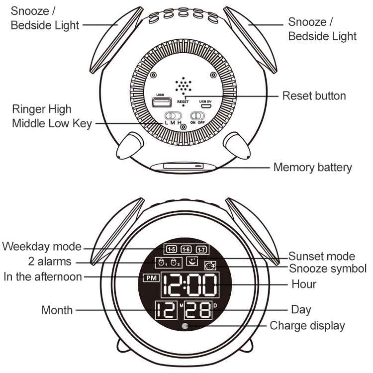 8. 2 group alarm clock independent switch, three groups of working day mode alarm clock, 25 music ringtones. The alarm clock can be set to different music.