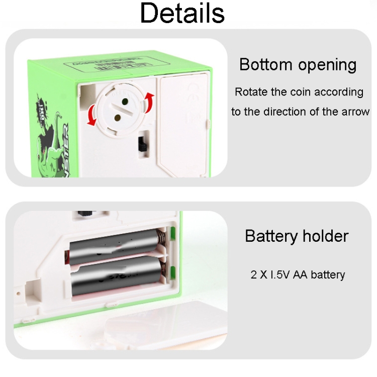 4. Usage: put the coin in the groove position; press to switch the button; the dinosaur reaches out to steal the coin