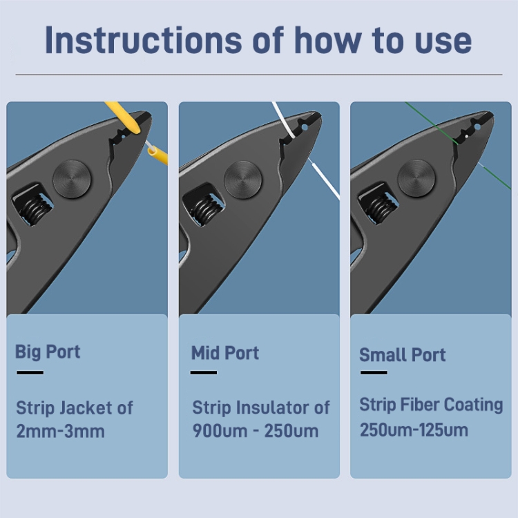 7. Cutting depth range of 3 ports: large hole is used to strip 2mm-3mm pigtail/jump wire outer protective layer, medium hole is used to strip 900 micron-250 micron pigtail/jump wire white soft rubber protective layer, small hole is used For stripping the coating layer of 250 micron-125 micron fiber core