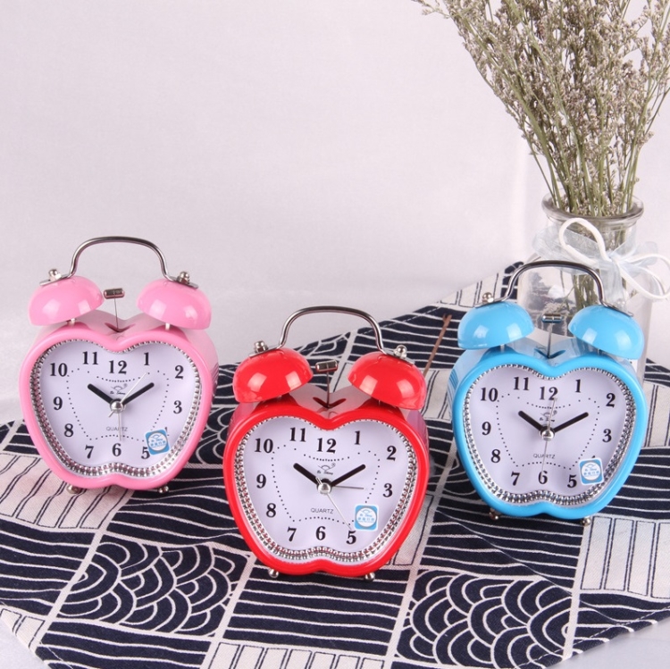 Children Cartoon Apple-Shaped Bedside Mute Desk Clock Metal Bell Digital Alarm Clock, Red, Blue, Pink