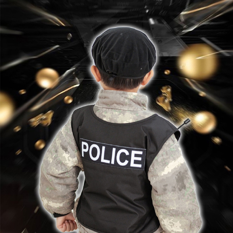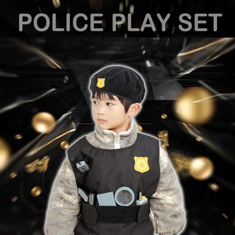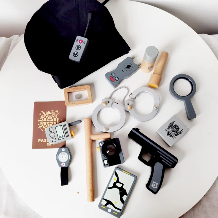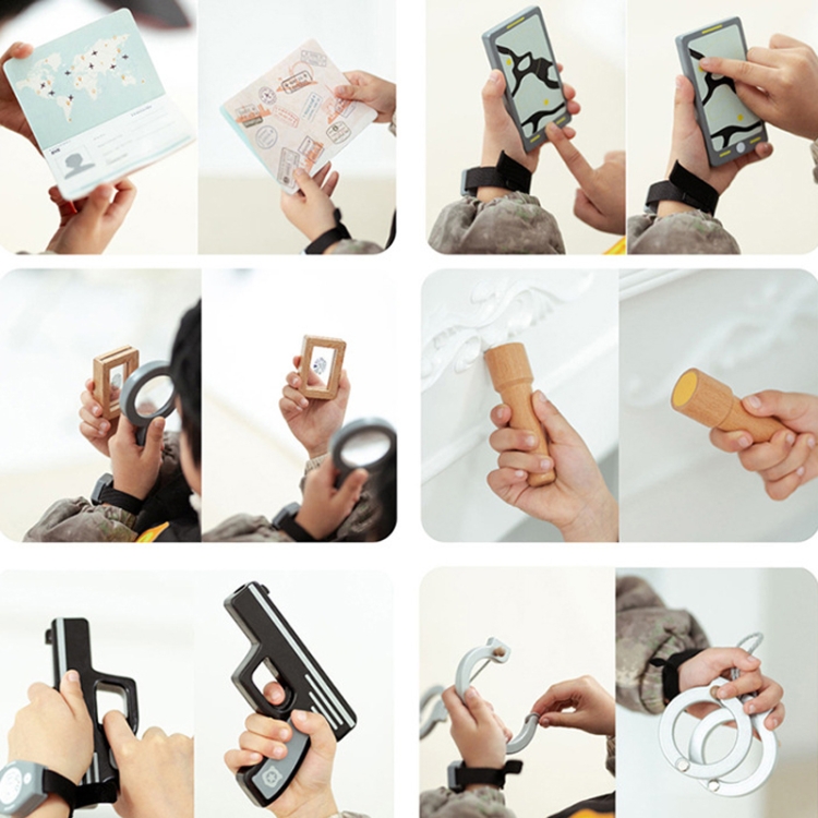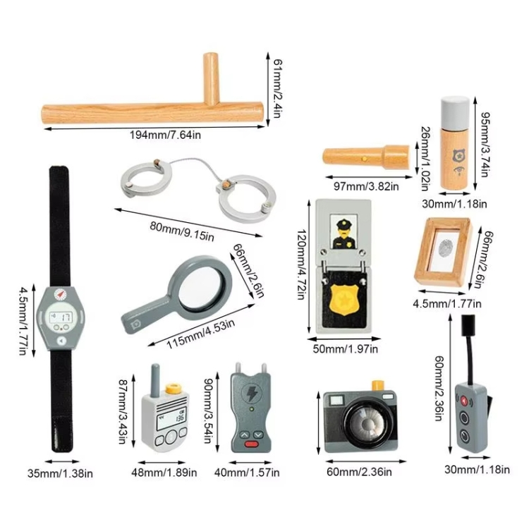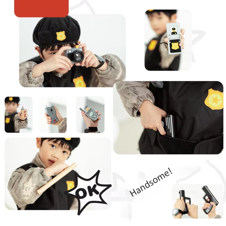 8. Packing list: 17pcs/set – police cap + police uniform + wireless microphone + camera + pistol + watch + magnifying glass + walkie-talkie + fingerprint collector + police sprayer + handcuffs + stun gun + flashlight + truncheon + cell phone + documents + passport