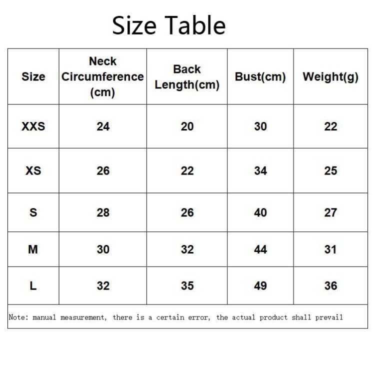 3. Neck circumference: XXS is about 24 cm, XS is about 26 cm, S is about 28 cm, M is about 30 cm, and L is about 32 cm