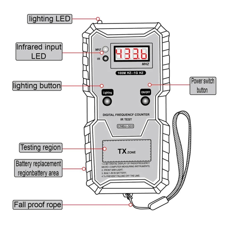 1. “ON/OFF” is the power key for external frequency line test. The remote control that needs tobe tested will be emited close to this frequency meter(Placed in the test area), press the remotecontrol to open, you can test the frequency of the remote control, clearly displayed Frequencyvalue. (The effective test range is no more than 5CM. The closer the test area is, the moreaccurate the measured value will be;Car key frequency is generally divided into 320M HZ.434M HZ;868M HZ;)