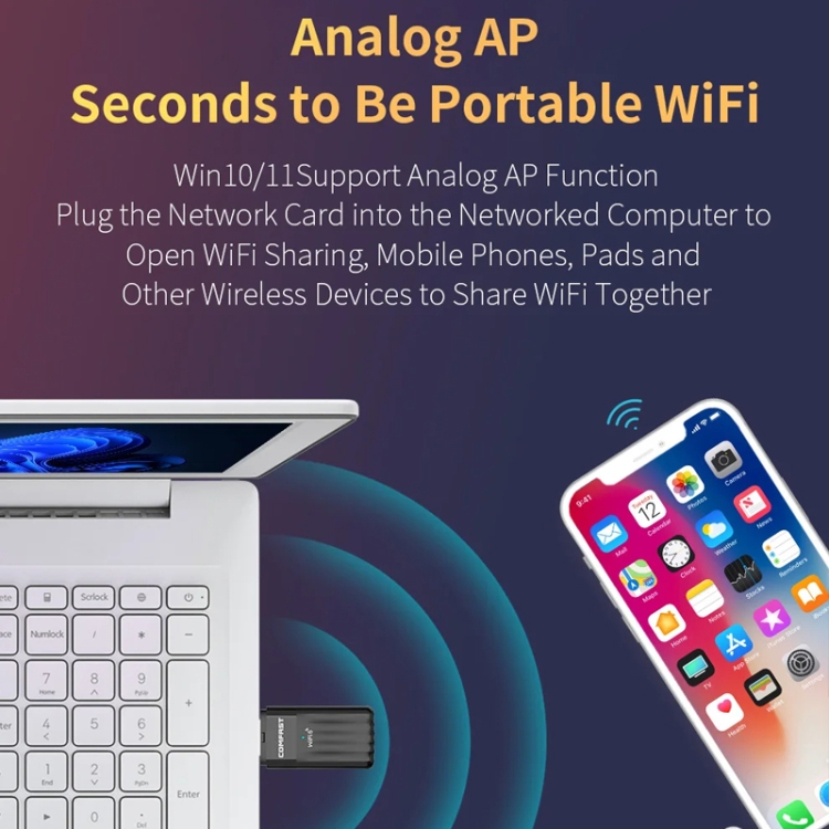 8. The Win10/11 system supports the simulated AP function. Insert the network card into a connected computer to enable WiFi sharing, allowing mobile phones, tablets and other wireless devices to share Wi-Fi.
