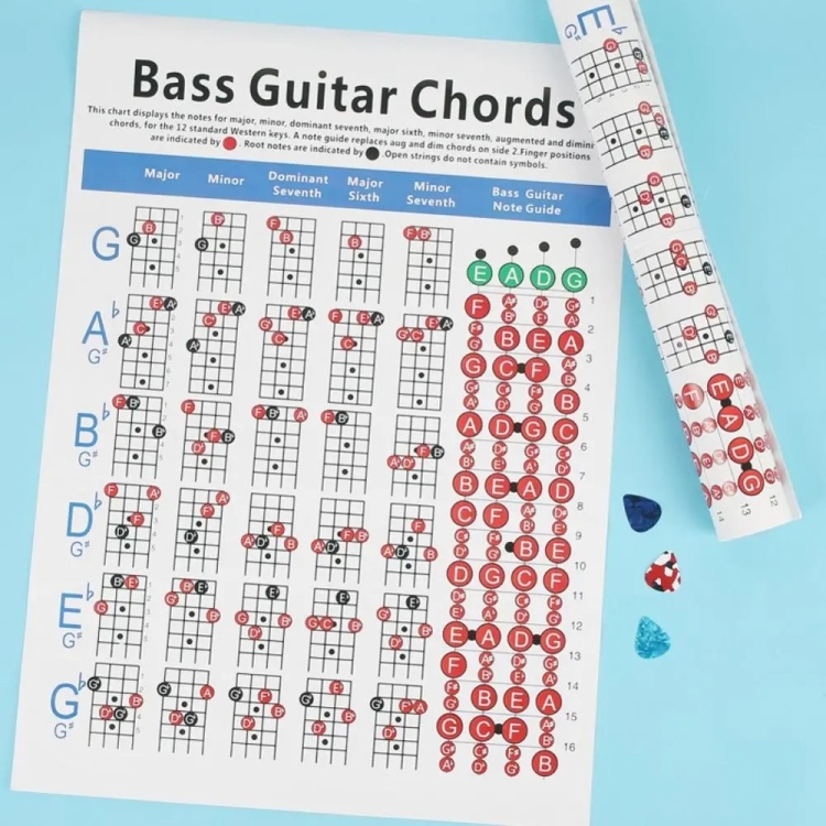 3. 4-String Bass Guitar Chord Diagram (for both acoustic and electronic models) This layered diagram shows the common notes that make up a “4-string” bass guitar E, A, D, and G