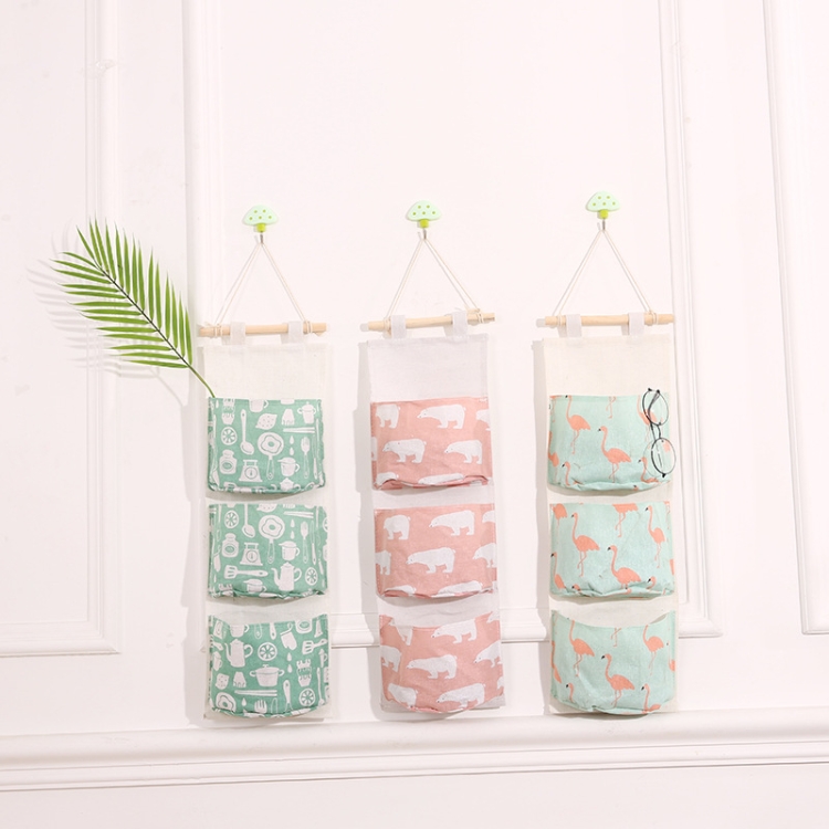 Cotton Linen Hanging Storage Bag 3 Pockets Wall Mounted Wardrobe Hang Bag Wall Pouch Cosmetic Toys Organizer, White flamingo, Green flamingo, Coffee geometric, Green tableware, Pink polar bear