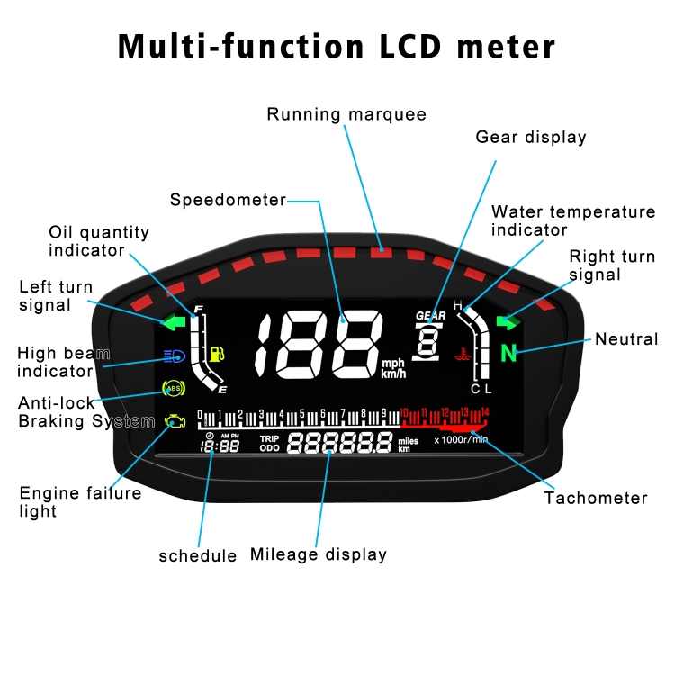 3. Features include (speedometer, tachometer, fuel gauge, water temperature gauge), clear LCD screen, large viewing angle, soft vision, and relieve eye fatigue