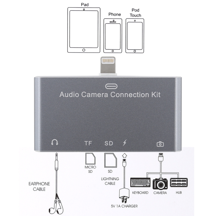D-198 5 in 1 8 Pin to USB HUB +USB-C / Type-C + 3.5mm Earphone + SD + TF Card Reader for MacBook, PC, Laptop, Smart Phones