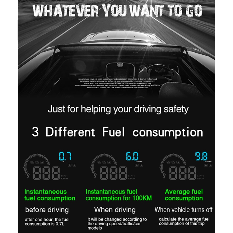 5. OBD mode display information: engine speed, instantaneous fuel consumption, instantaneous fuel consumption, instantaneous fuel consumption, average fuel consumption, water temperature, voltage, driving distance, driving time, mile switching