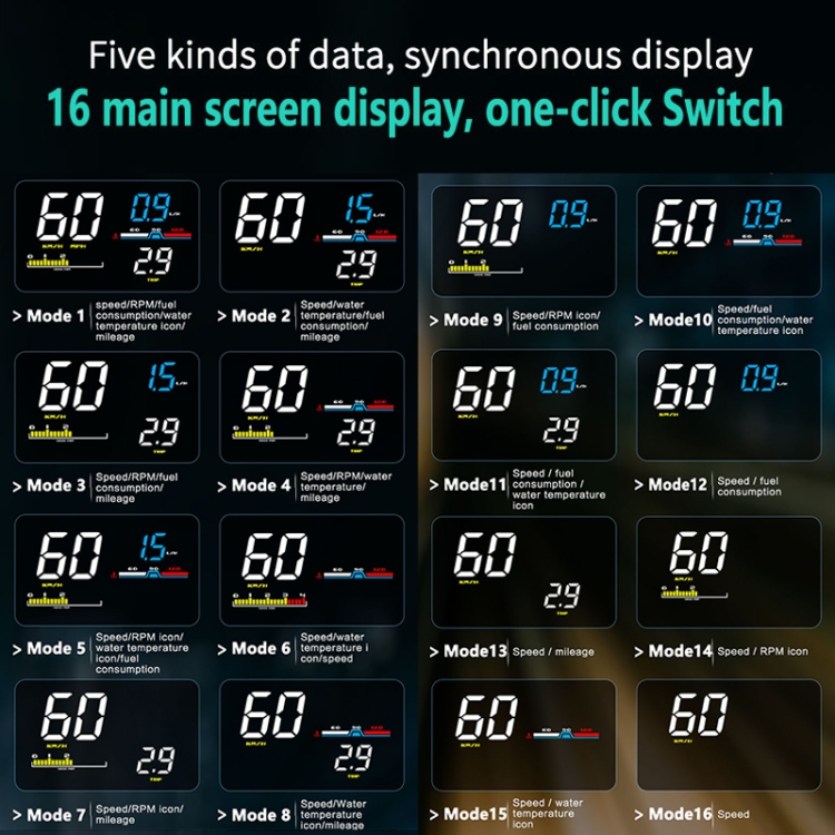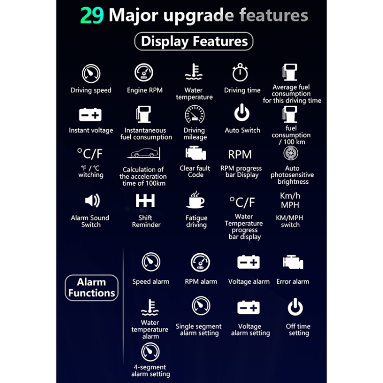 4. Display information: driving speed, water tank temperature, battery voltage, engine speed, instantaneous fuel consumption, 100 kilometers of instantaneous fuel consumption, the number of kilometers of this trip, this travel time, 100 kilometers of acceleration time, detection of fault codes, elimination of fault codes