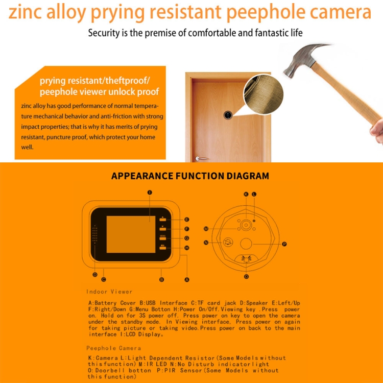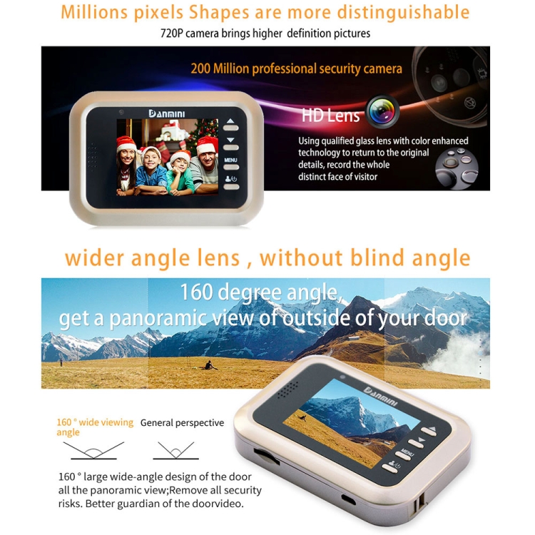 1. Danmini intelligent Peephole Viewer creat the new century.It is the last line of home security.Without destroying the door structure under the premise of the existing use of the peephole, no drilling, no wiring, can be used after installation. The product is equipped with intelligent operating system with humanized multi-mode design. Simple and convenient for the elderly and children. For your home security escort.