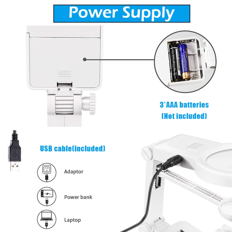 7. Power supply: 3 AA batteries (not included), can be plugged into USB for power supply