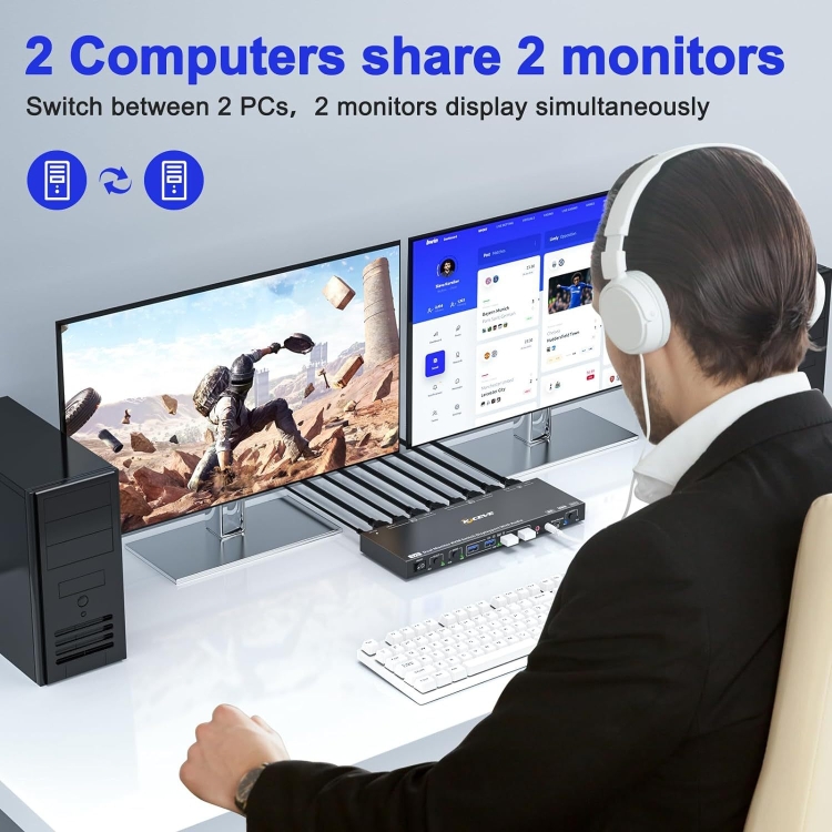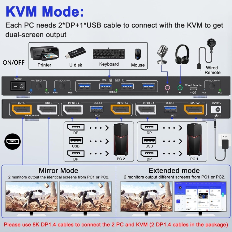 1. DP port KVM switch, suitable for DP port devices to share keyboard, mouse and monitor. In copy mode, the main screen can be copied to the second output screen. In extended mode, windows from the main screen can be dragged to the second output screen.