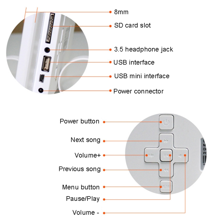 – USB: with a laptop / desktop / tablet PC and other USB interface connection (subject to digital photo frame itself with memory)