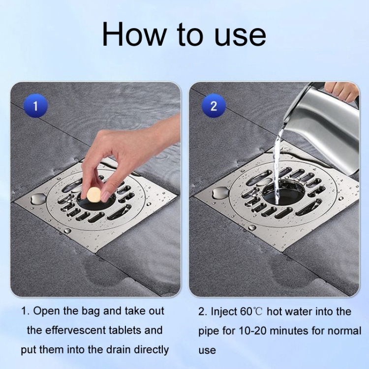 7. Method of use: open the bag and take out the effervescent tablets directly into the drain; inject 60 degrees celsius hot water into the pipeline, 10-20 minutes for normal use