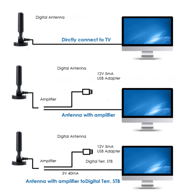 | Option | 5dBi, USB 22dBi, SMA 18dBi, 25 Miles 28dBi, 50 Miles 20dBi DVB-T2, 50 Miles 25dBi White, 50 Miles 28dBi, 50 Miles 25dBi Black, 60 Miles 25dBi, USB 50 Miles 25dBi, 80 Miles 28dBi, 50 Miles 20dBi, FM Radio Antenna, FM Antenna (BNC), 12dBi SMA, 12dBi RP-SMA, 2.4G SMA 18dBi, 22dBi DVB-T / USB, FM Dipole Antenna |