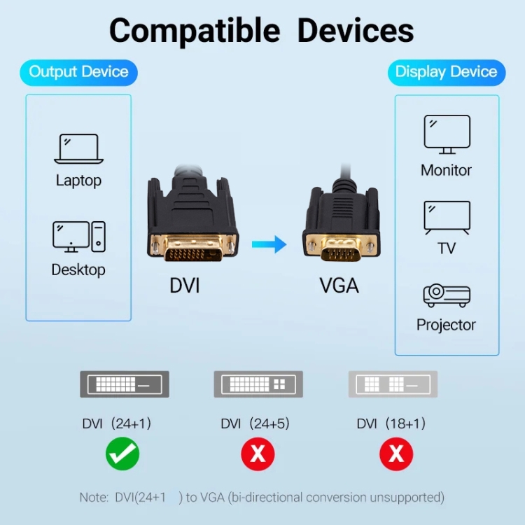 1.Fits for a display device that is connected to a VGA interface with a signal source with a DVI port, such as a monitor and a projector