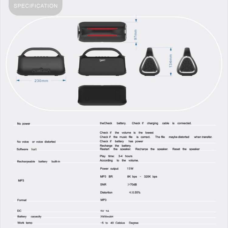 12. Output power: 15W (1 speaker unit: 66mm, external magnet, 4 ohms, 15W + 2 low frequency amplifiers)