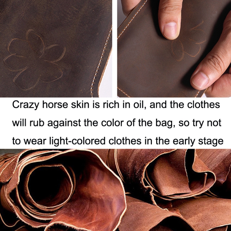 5. Crazy horse skin is rich in oil, and the clothes will rub against the color of the bag, so try not to wear light-colored clothes in the early stage