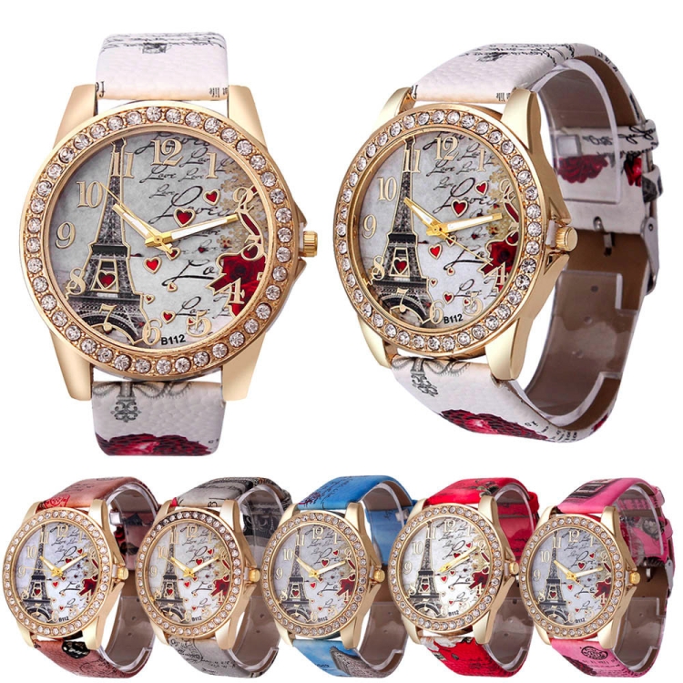 Eiffel Tower + Heart Pattern Leather Strap Quartz Watch for Women