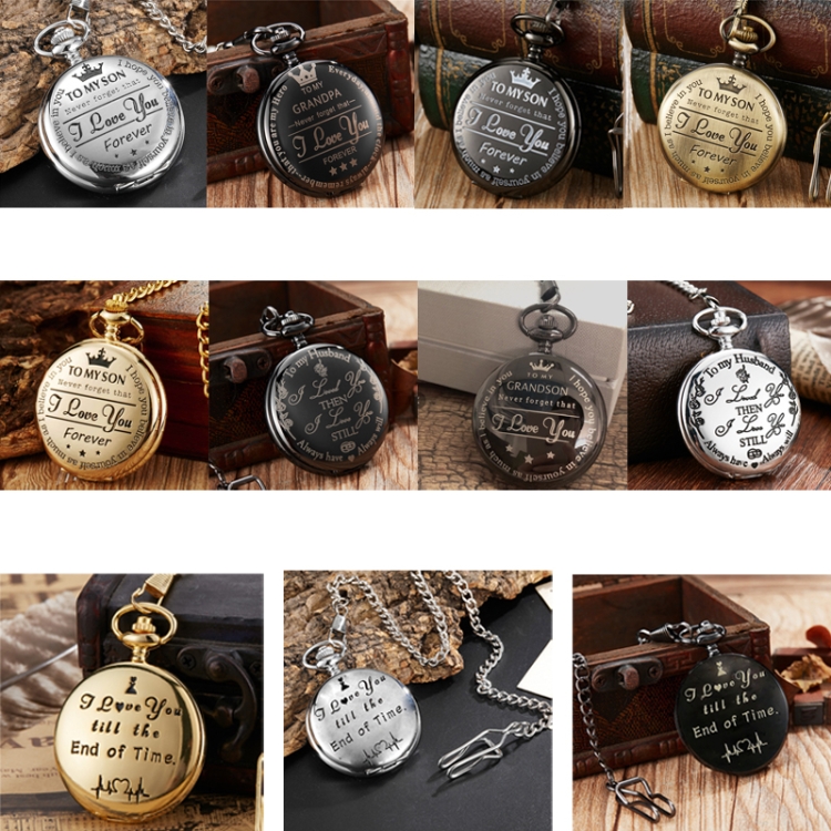 | Option | Gear Embossed Hollow, I Love You (Black), I Love You (Silver), I Love You (Gold), Grandson (Black), Hushand (Silver), Husband, Grandpa, Matte Ancient Copper, Round Opening Gold Shell Gold Face, Gold Shell Gold Face Movement, Silver Shell Silver Face Silver Movement, Black Shell Black Face Gold Movement, Skeleton Pattern, Playing Card Pattern, Butterfly Pattern, Classical Hawk Pattern |