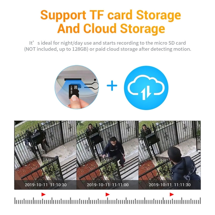 9. Support TF card storage and cloud storage, it is ideal for night / day use and starts recording to the micro SD card(up to 128GB, not included) or paid cloud storage after detecting motion