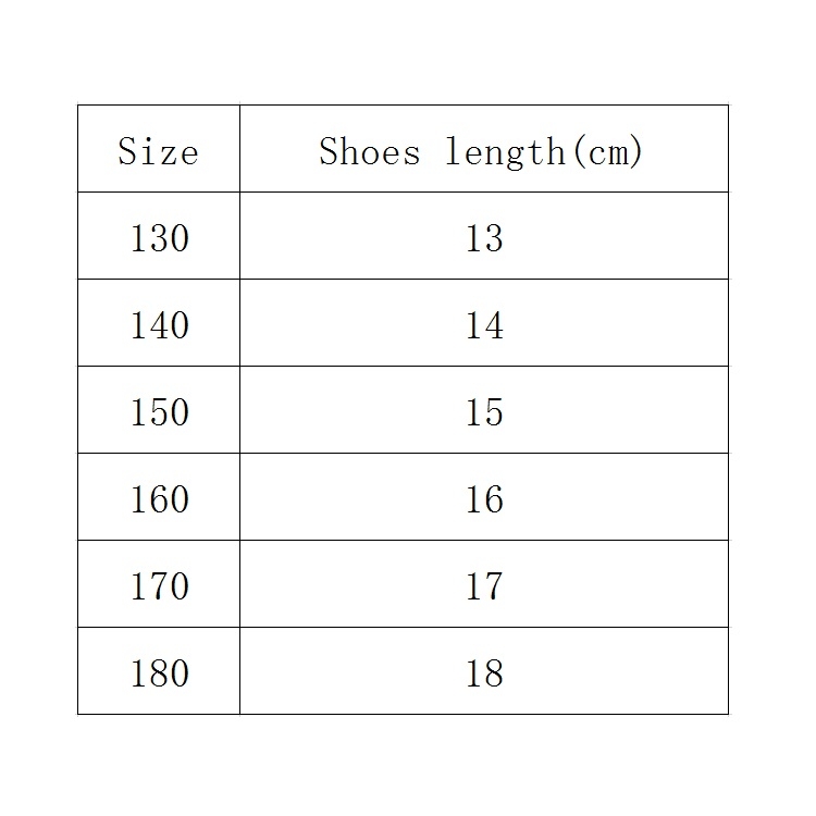 10. Size: 130 (shoe length 13cm), 140 (shoe length 14cm), 150 (shoe length 15cm), 160 (shoe length 16cm), 170 (shoe length 17cm), 180 (shoe length 18cm) )