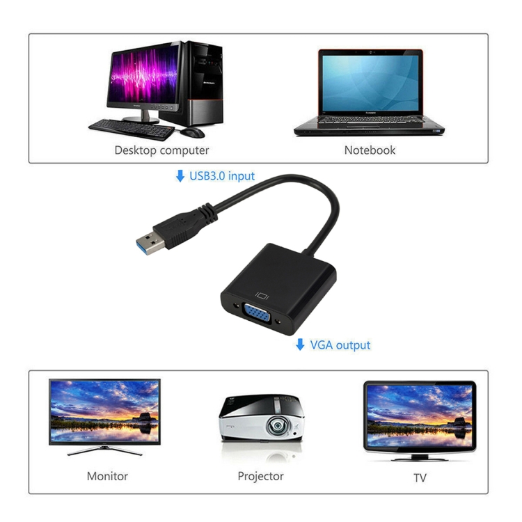 1. USB3.0 to VGA video converter connects your USB of laptop to CRT / LCD monitor, projector display device. So you can watch HD video on HDTV, projector that has VGA output.