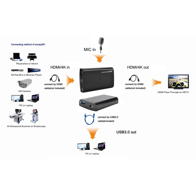 3. With HDMI pass-through, can connect with big displayer to play game once you streaming. With Micro Phone input, can record your voice with video together easily