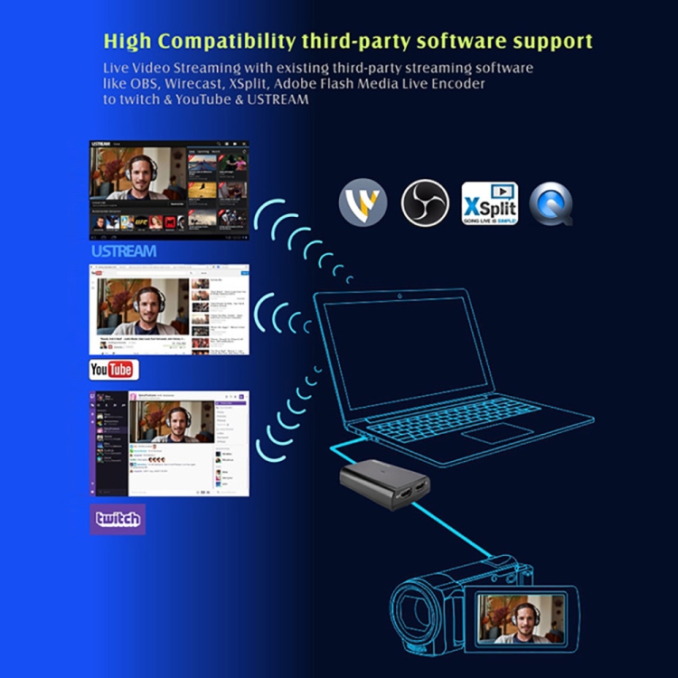 6. Software compatibility: OBS Studio (Windows, OS X), OBS Broadcast (Windows, Mac OS X),Adobe Flash Media Live Encoder (Windows, OS X), Real Producer Plus (Windows), QuickTime Broadcaster (OS X), QuickTime Player (OS X), Windows Media Encoder (Windows), Potplayer (Windows), Xsplit Broadcaster (Windows, OS X), VLC (Windows, OS X, Linux), Wirecast (Windows, OS X), vMix (Windows), AMCAP, and etc.